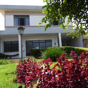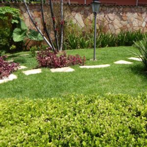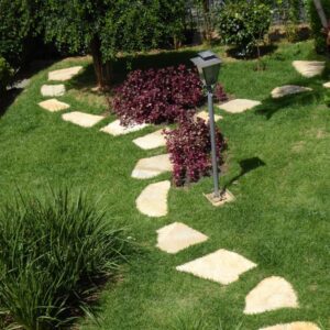 O caminho sinuoso de pedras irregulares cria um percurso fluido e orgânico pelo gramado, incentivando os moradores a usufruírem do jardim. A composição priorizou arbustos que adicionam textura e cor, criando pontos de interesse visual ao longo do caminho.